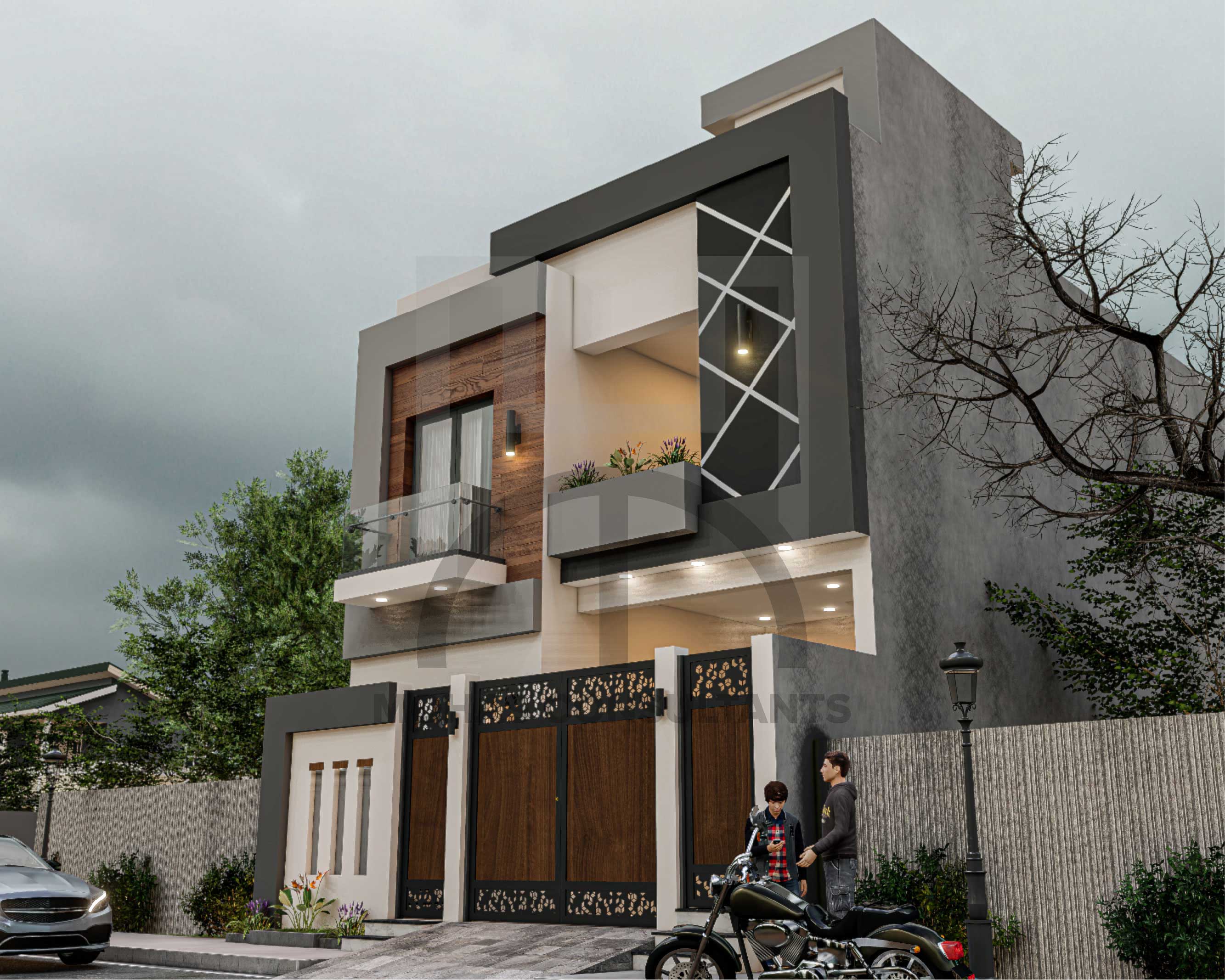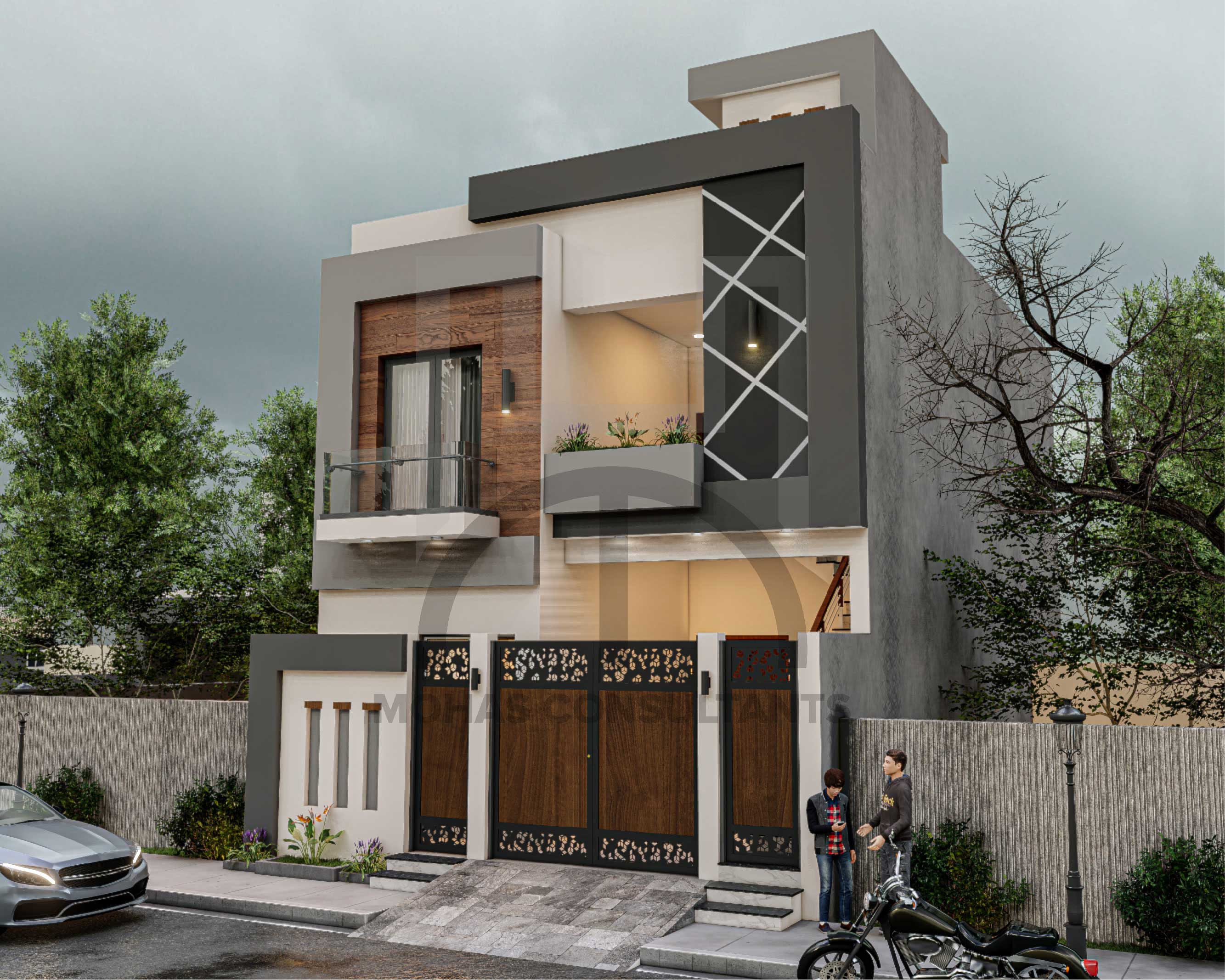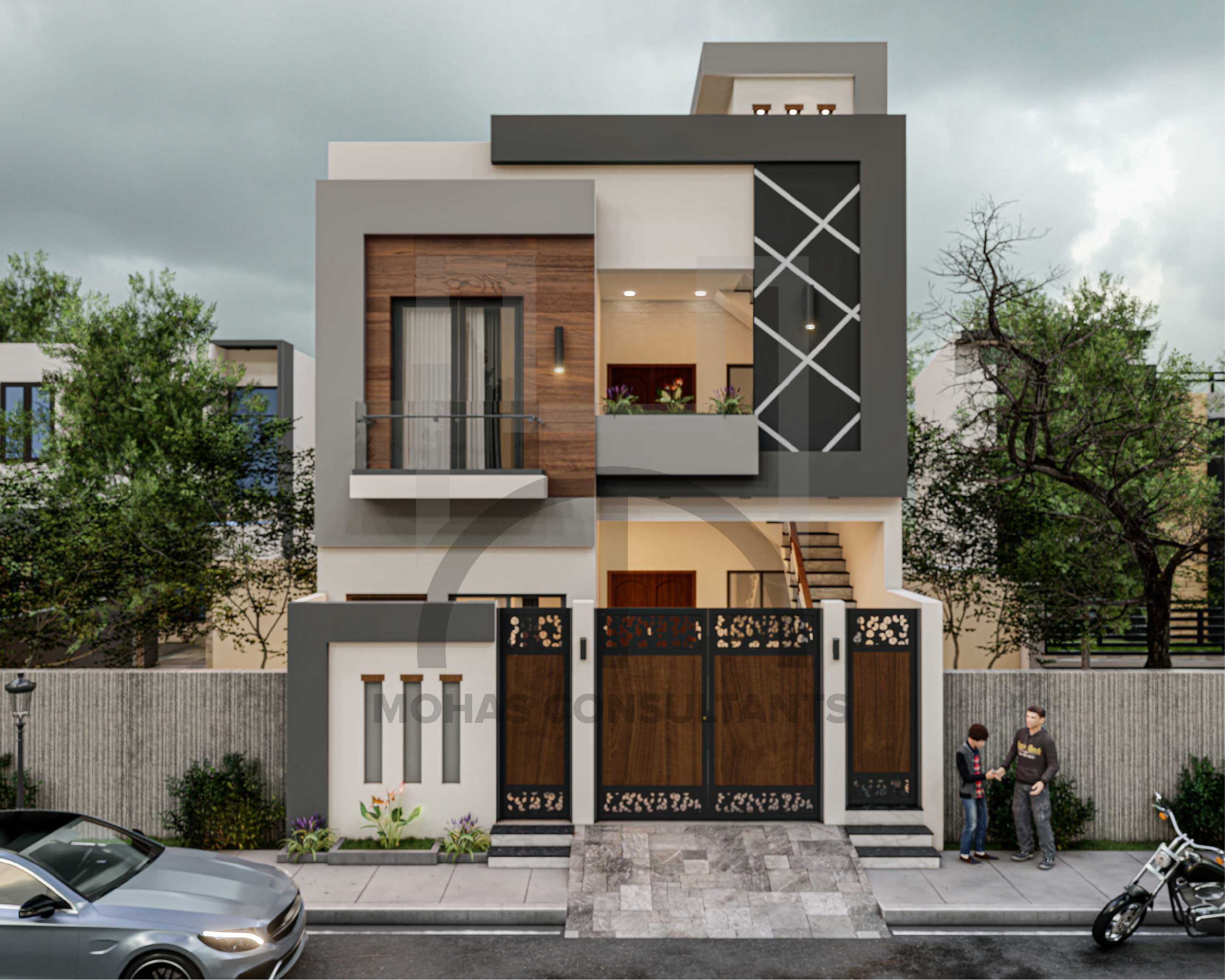This residential building showcases a contemporary façade with a bold mix of wood, grey, and white tones. Geometric patterns and sleek balcony designs add character and contemporary elegance. A stylish urban home that perfectly balances aesthetics with functional design.