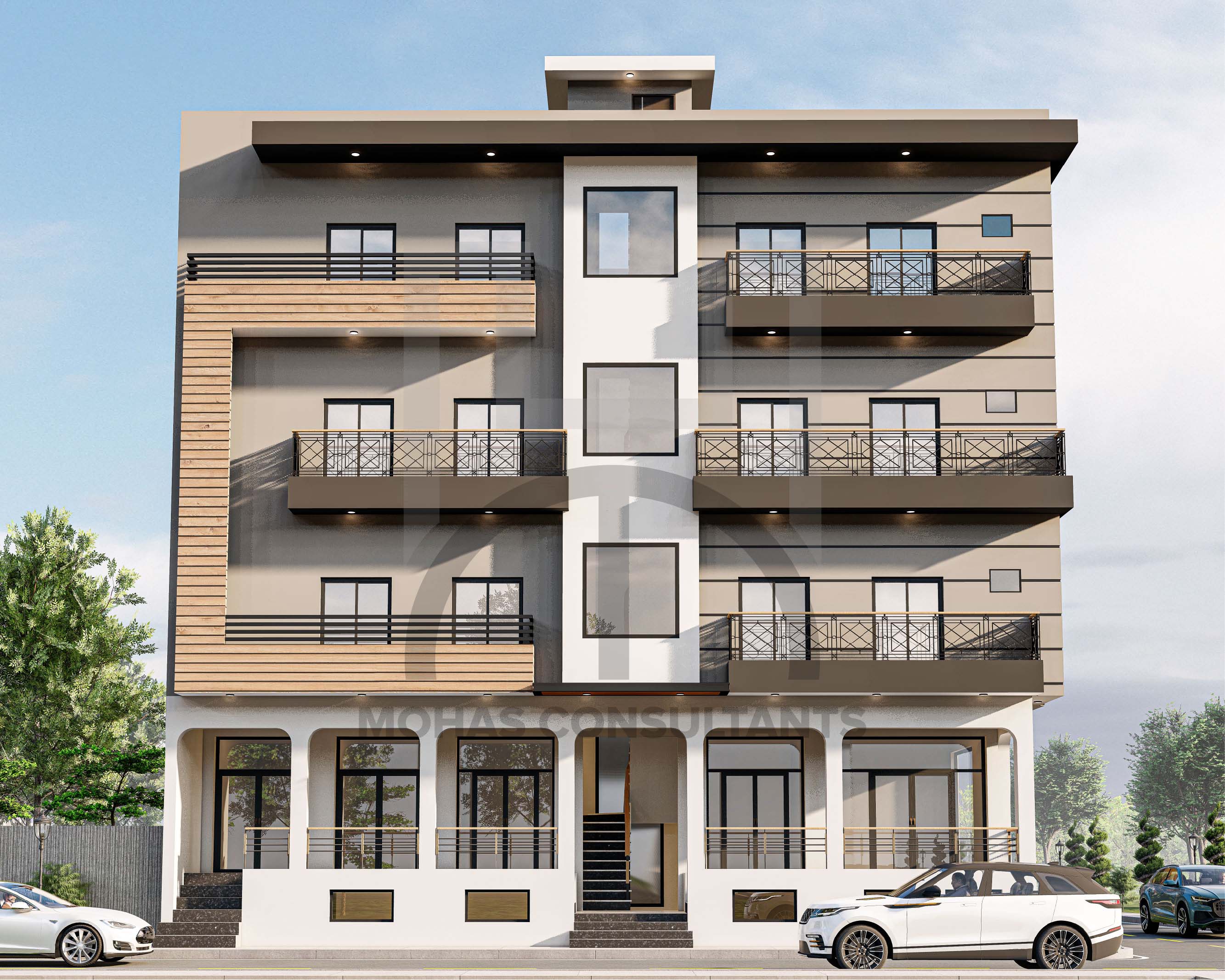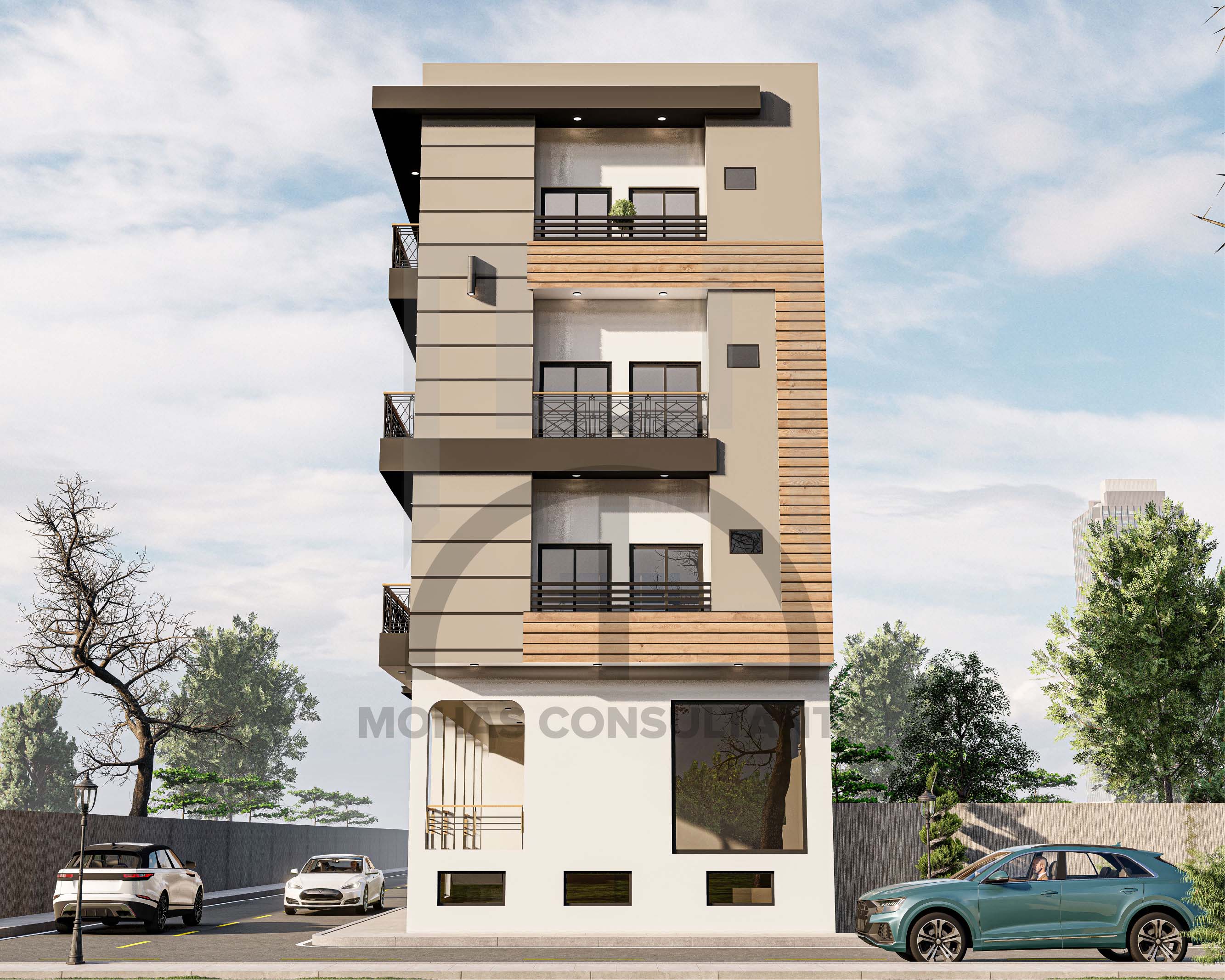 A stunning ground +3 floors commercial-cum-residential building designed by Mohas Consultants showcases contemporary architecture with sleek lines, functional layouts, and modern aesthetics. The design seamlessly blends commercial utility with residential comfort, creating a harmonious and stylish space.