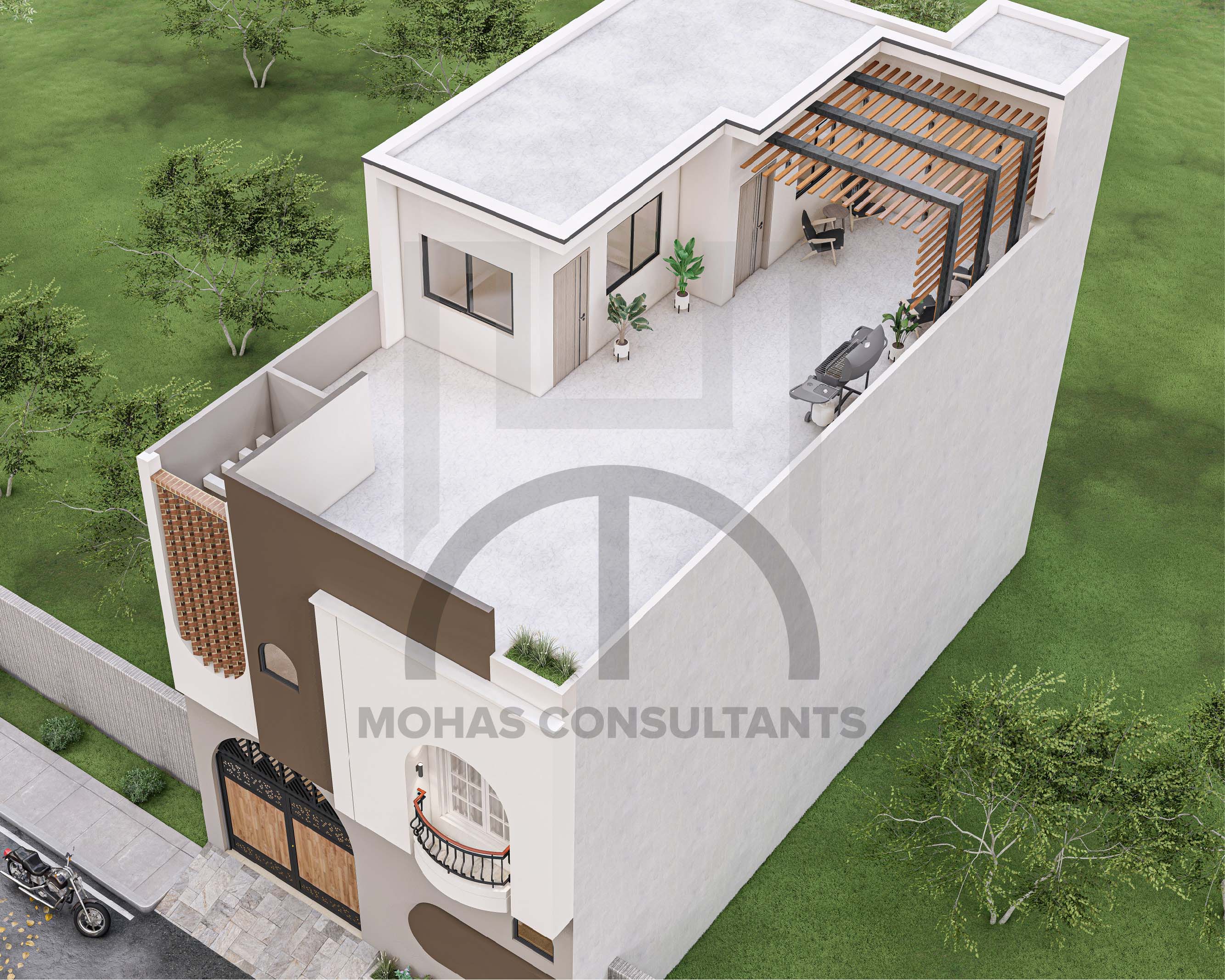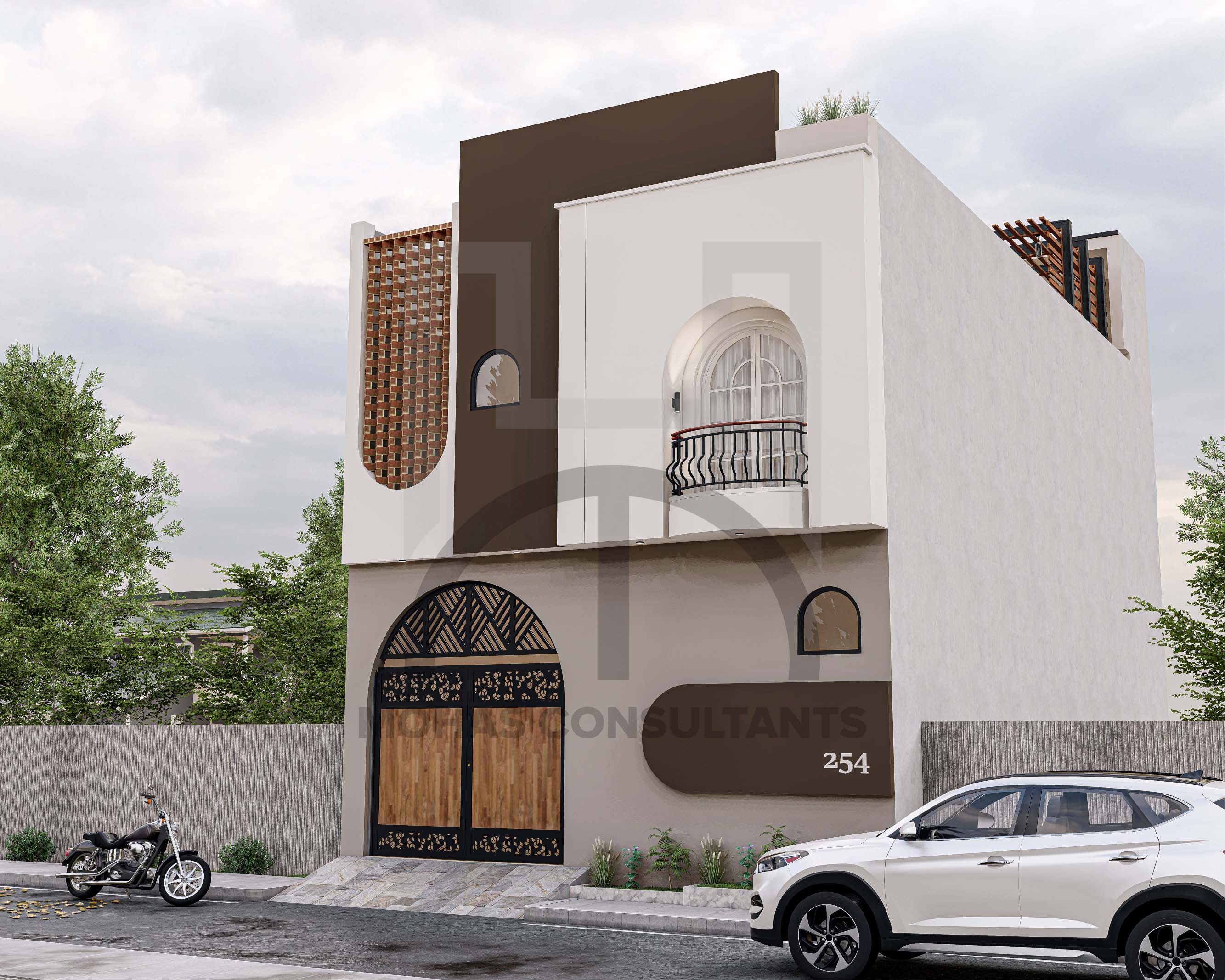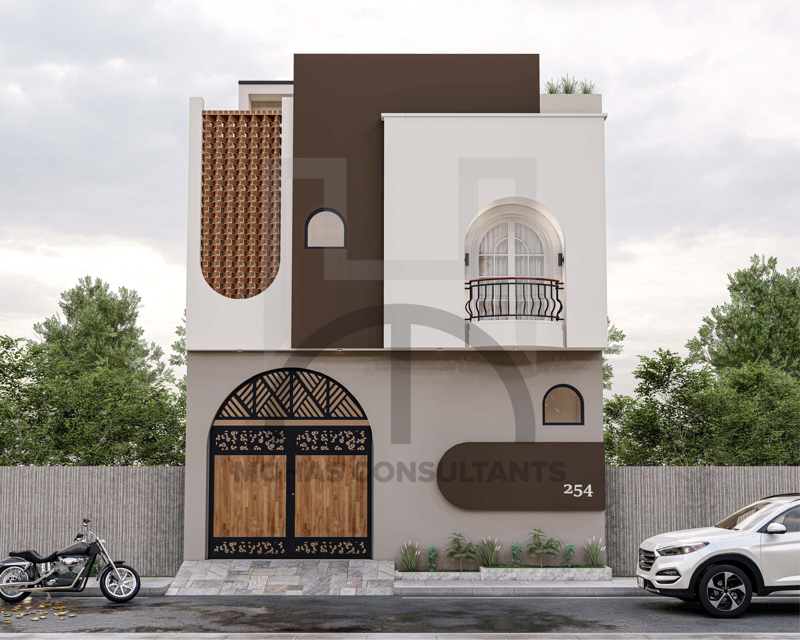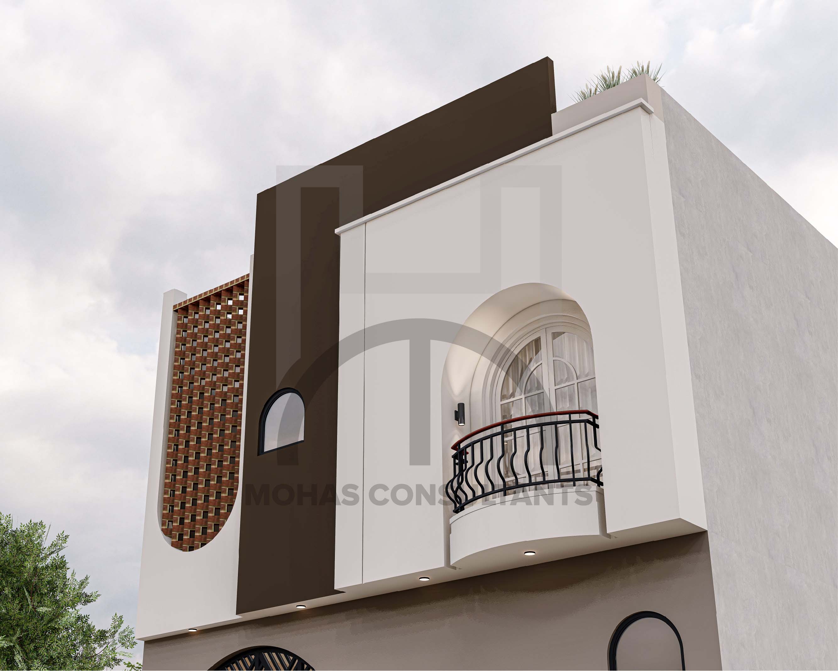 This residential building features a contemporary façade with a creative blend of geometric forms and earthy tones. The use of brick jali, arched openings, and a small balcony adds both cultural charm and modern elegance. Its bold contrasts and clean lines make it stand out as a stylish yet functional design.