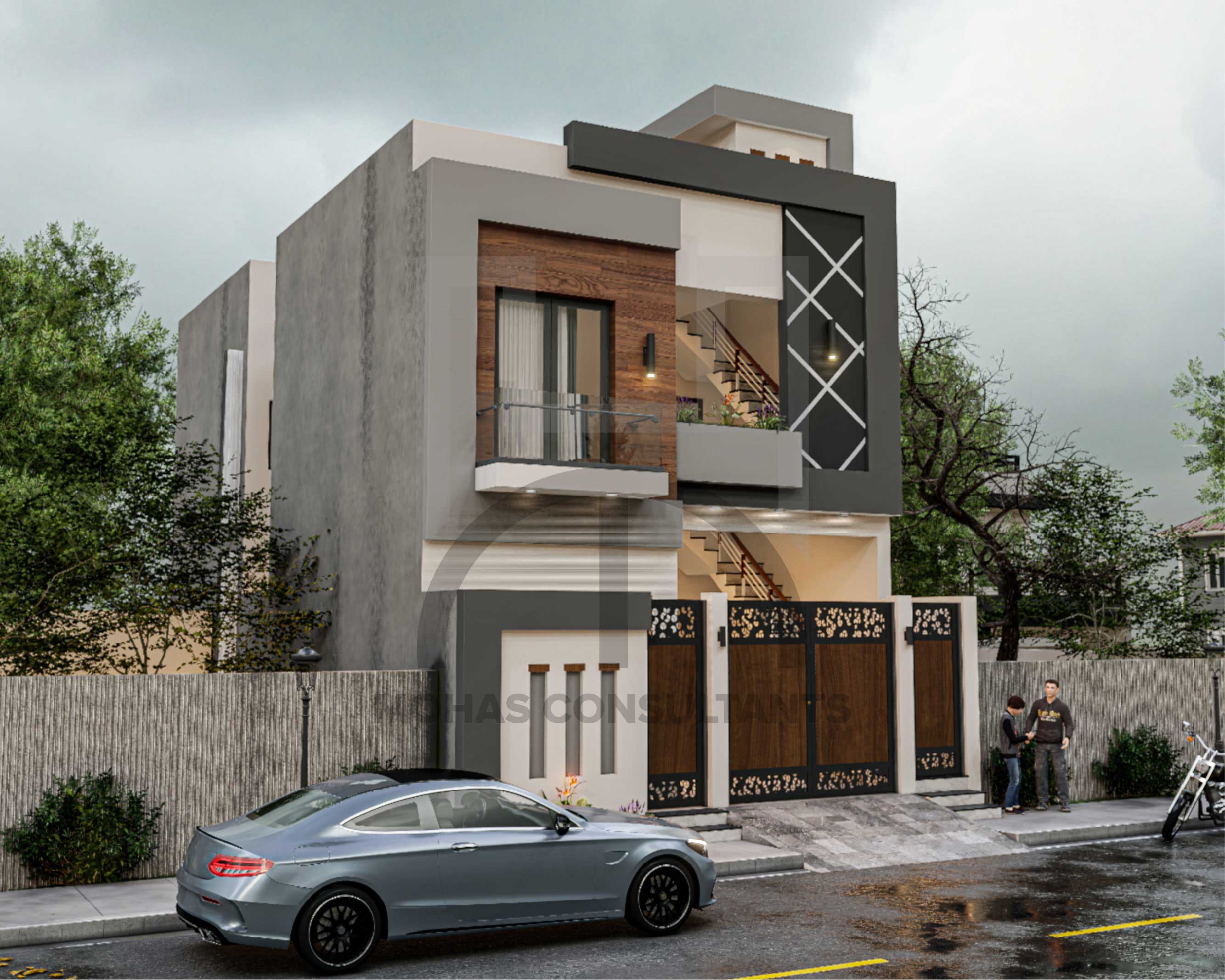 This residential building showcases a contemporary façade with a bold mix of wood, grey, and white tones. Geometric patterns and sleek balcony designs add character and contemporary elegance. A stylish urban home that perfectly balances aesthetics with functional design.