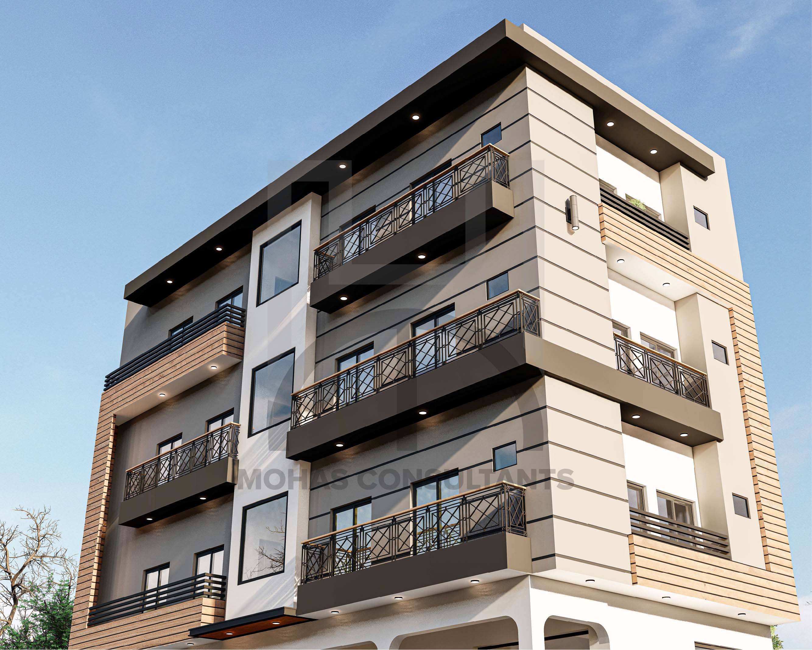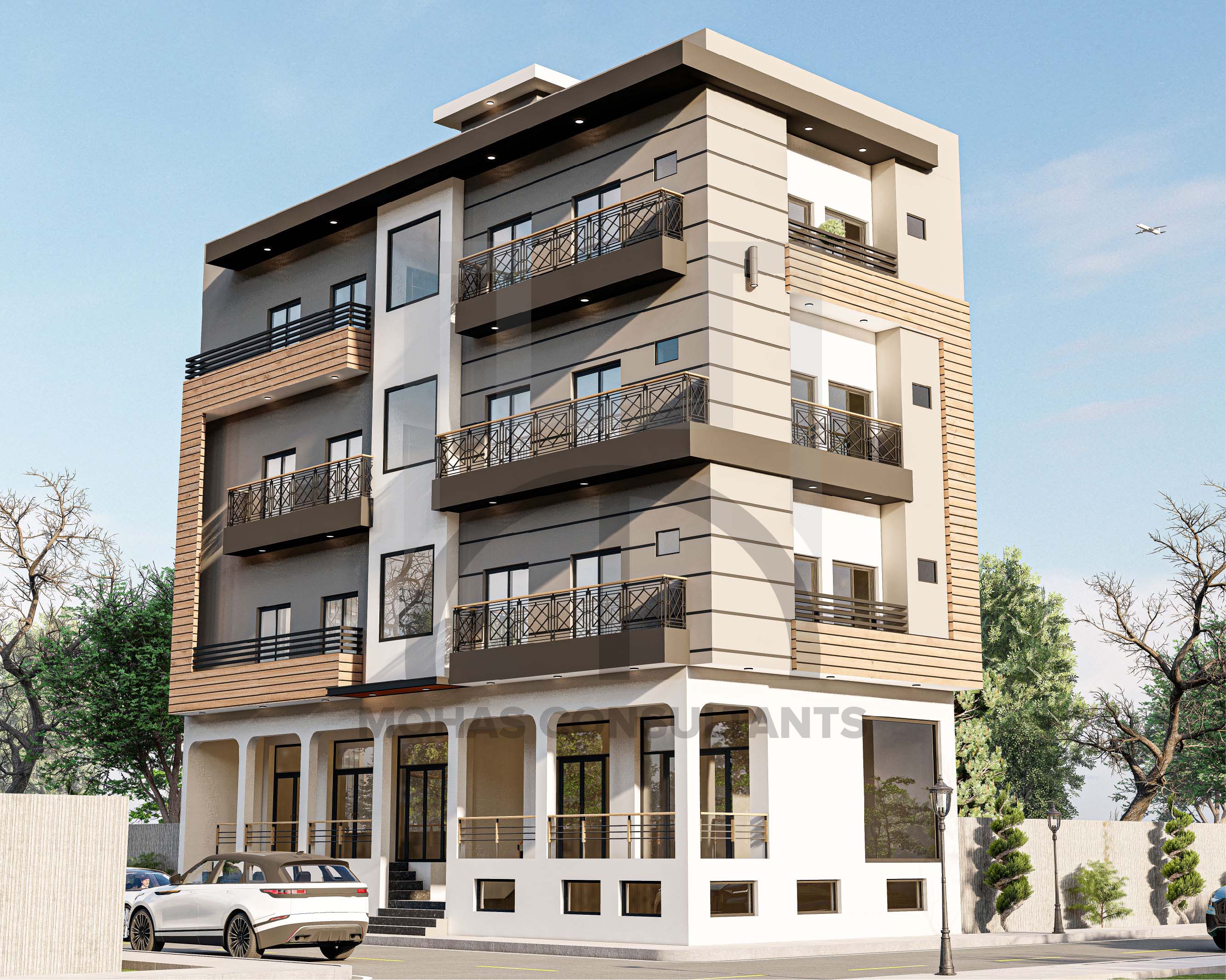 A stunning ground +3 floors commercial-cum-residential building designed by Mohas Consultants showcases contemporary architecture with sleek lines, functional layouts, and modern aesthetics. The design seamlessly blends commercial utility with residential comfort, creating a harmonious and stylish space.