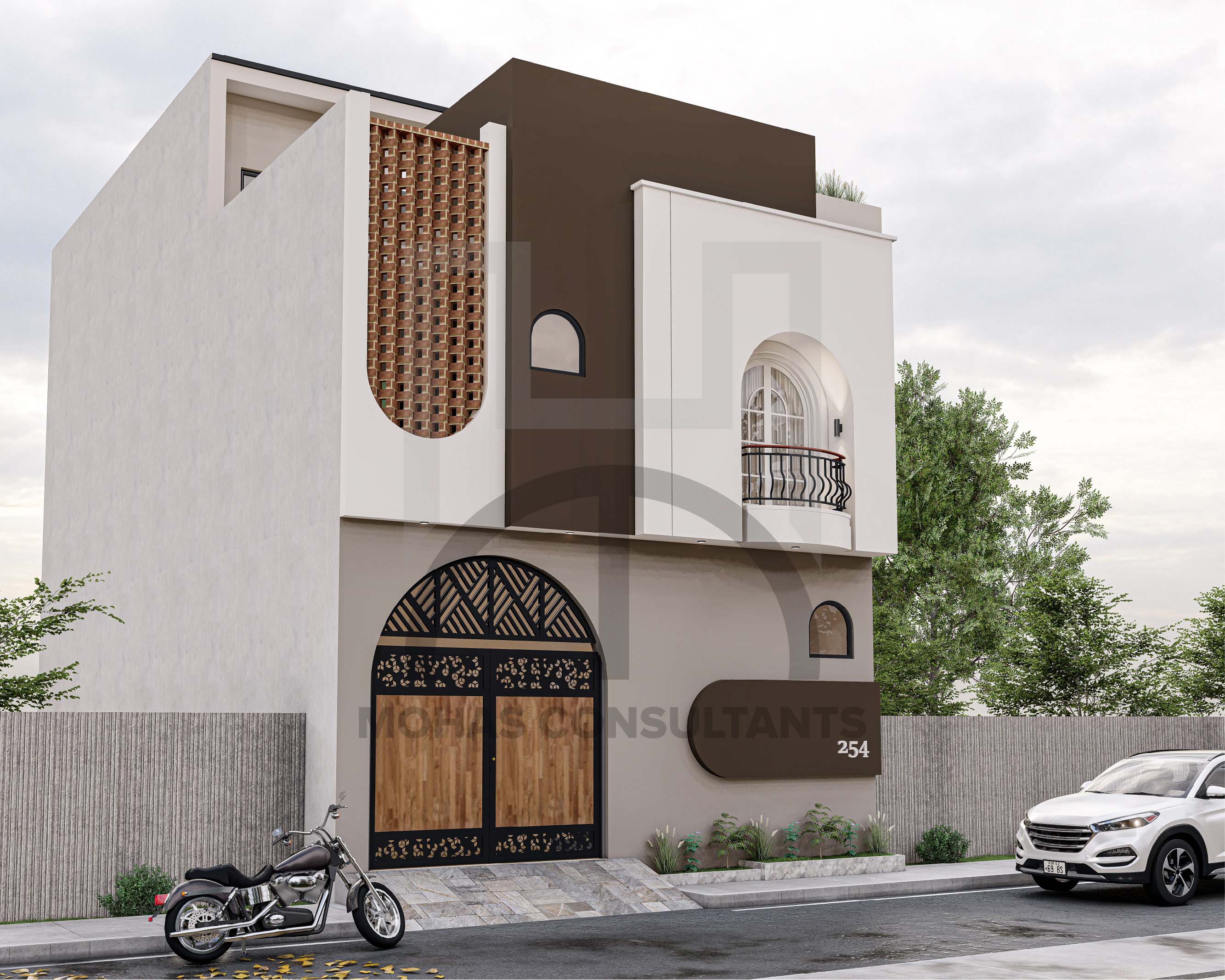 This residential building features a contemporary façade with a creative blend of geometric forms and earthy tones. The use of brick jali, arched openings, and a small balcony adds both cultural charm and modern elegance. Its bold contrasts and clean lines make it stand out as a stylish yet functional design.